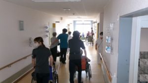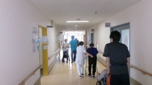 入所者様・通所ご利用者様にも協力頂き、転倒事故に気を付けながら非常口まで避難誘導。