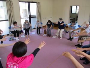 看護師による体操も行われ、左右違う動きを間違わずにできるか……